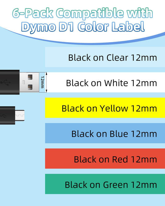 6X MarkField Compatible Label Tape Replacement for Dymo D1 45013 Color Tape 12mm x 7m, Compatible with DYMO LabelManager 160 210D 280 420P 360D 500TS PnP, LW 450 Duo Label Maker, 6-Pack