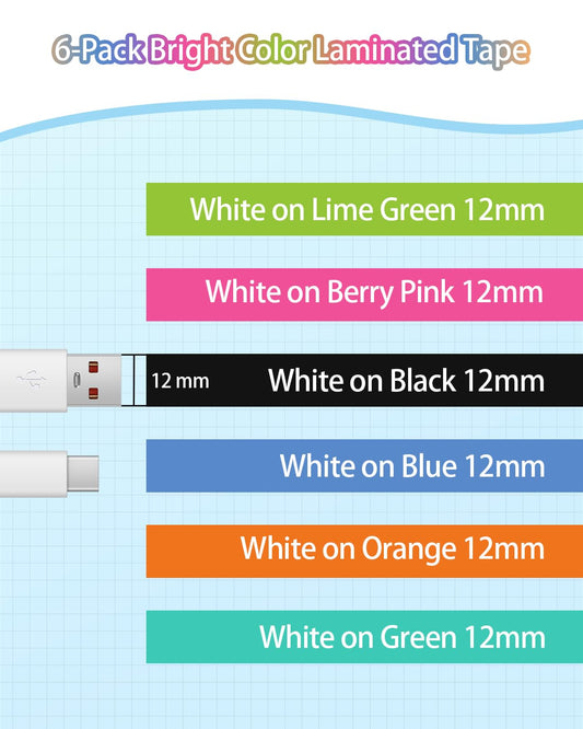 MarkField 6x Colore Nastro Compatibile con Dymo LabelManager Etichette Autoadesive, 12mm x 7m, Compatibile per Dymo LabelManager 160 220P 420P, LabelWriter 450 DUO, LabelPoint 150 250