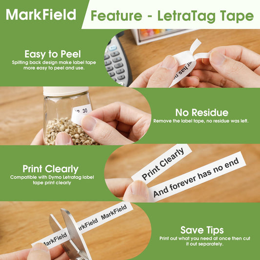 Nastro per Etichette Ricarica MarkField Compatibile In sostituzione di Dymo LetraTag Carta Nastri Etichette per LT-110T LT-100H, Nero su Bianco (Compatibile per Dymo Letratag Paper White)