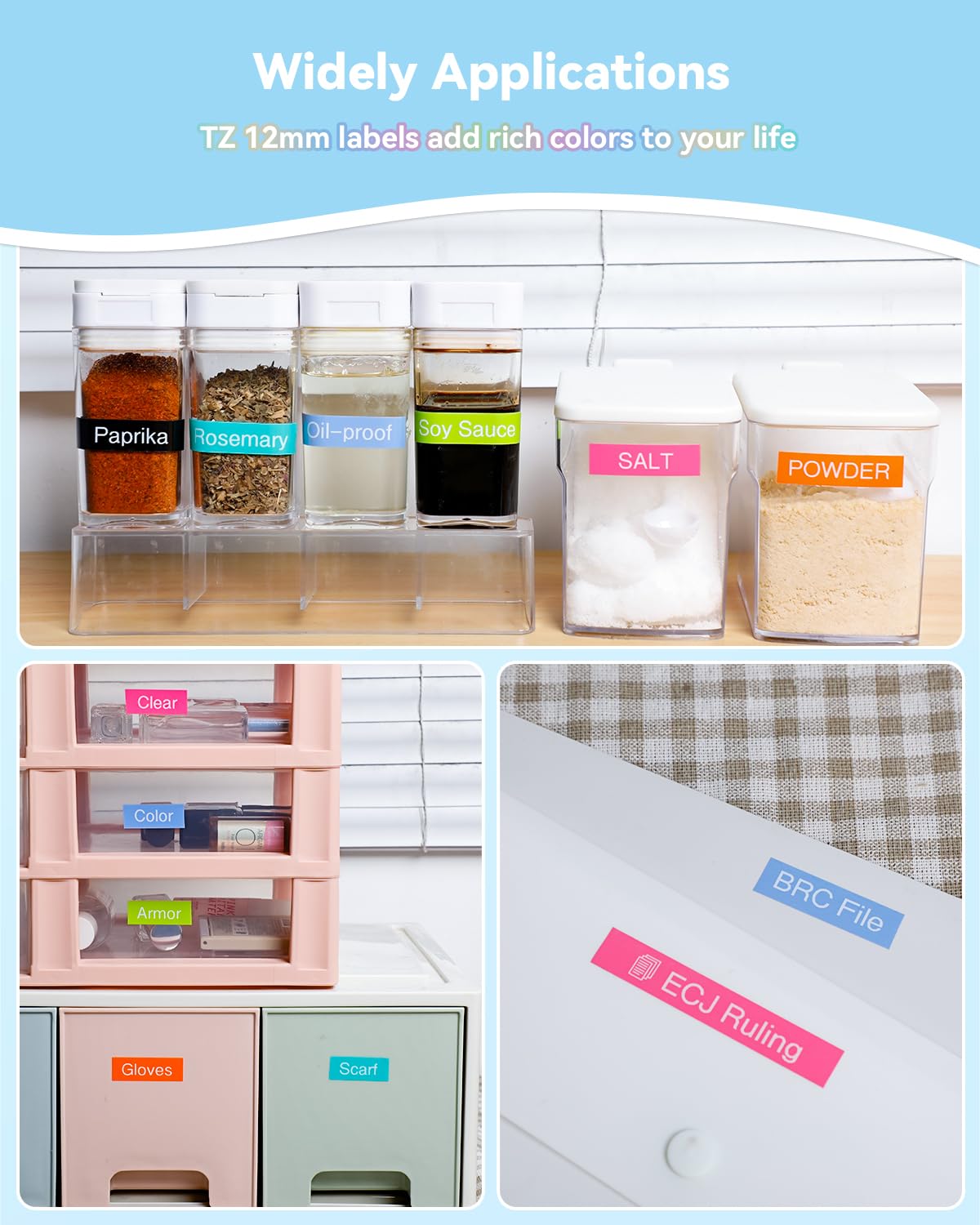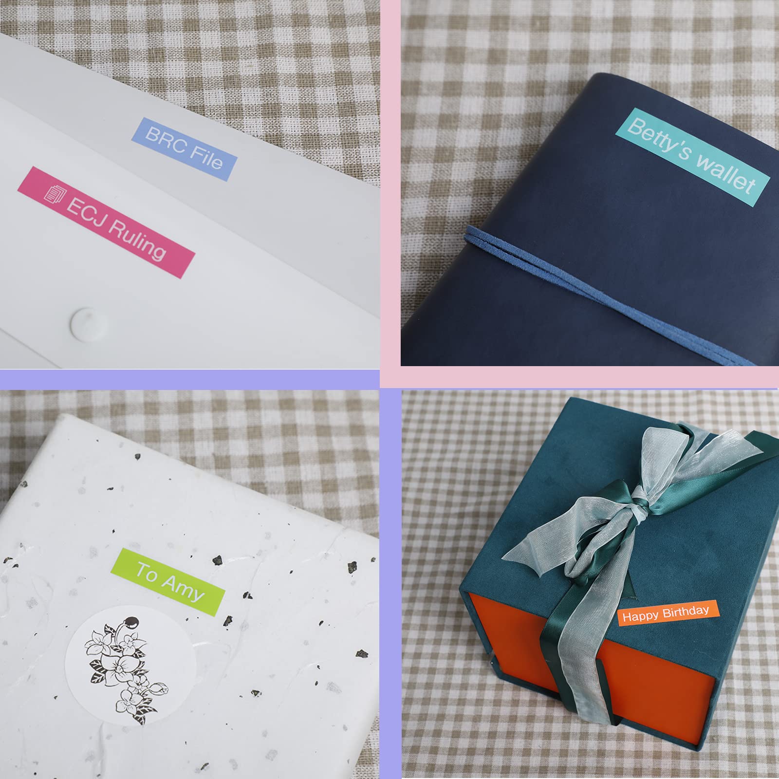 - Compatible avec Brother P Touch étiqueteuse plusieurs couleurs laminé TZ TZe-MQP35 535 635 735 335 MQG35. Couleur : blanc sur rose baies, blanc sur bleu, blanc sur jaune, blanc sur vert, blanc sur noir, blanc sur vert citron vert, lot de 6 (0,47 pouces) 12 mm x 8 m.